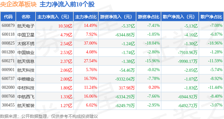 从资金流向上来看,当日央企改革板块主力资金净流出56.2亿元,游资资金净流出7292.16万元,散户资金净流入56.93亿元。央企改革板块个股资金流向见下表: