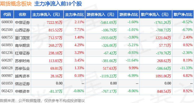 从资金流向上来看,当日期货概念板块主力资金净流出5.15亿元,游资资金净流入6430.22万元,散户资金净流入4.51亿元。期货概念板块个股资金流向见下表: