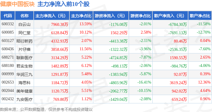 从资金流向上来看,当日健康中国板块主力资金净流出12.77亿元,游资资金净流入2.13亿元,散户资金净流入10.64亿元。健康中国板块个股资金流向见下表: