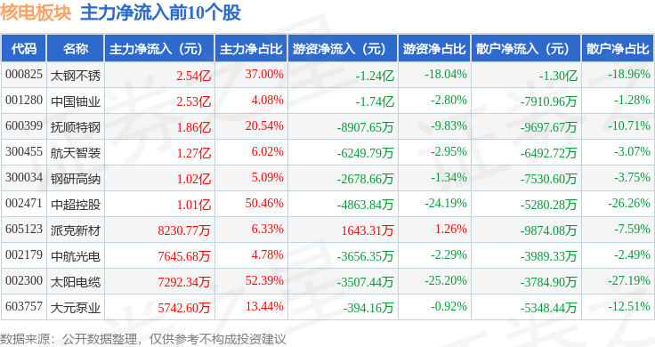 从资金流向上来看,当日核电板块主力资金净流出57.72亿元,游资资金净流入6.98亿元,散户资金净流入50.75亿元。核电板块个股资金流向见下表: