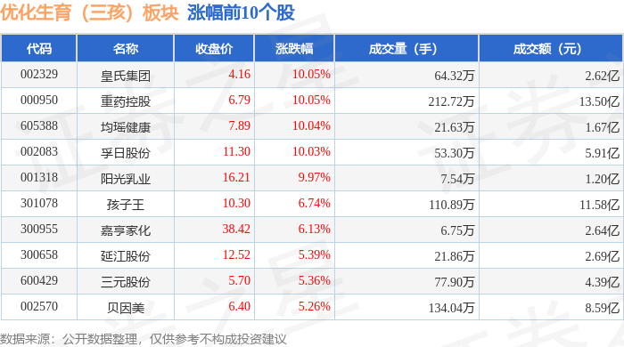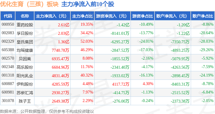 从资金流向上来看,当日优化生育(三孩)板块主力资金净流入4.31亿元,游资资金净流出1.79亿元,散户资金净流出2.52亿元。优化生育(三孩)板块个股资金流向见下表: