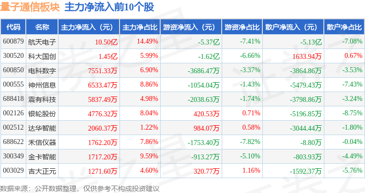从资金流向上来看,当日量子通信板块主力资金净流出25.69亿元,游资资金净流入1267.07万元,散户资金净流入25.57亿元。量子通信板块个股资金流向见下表: