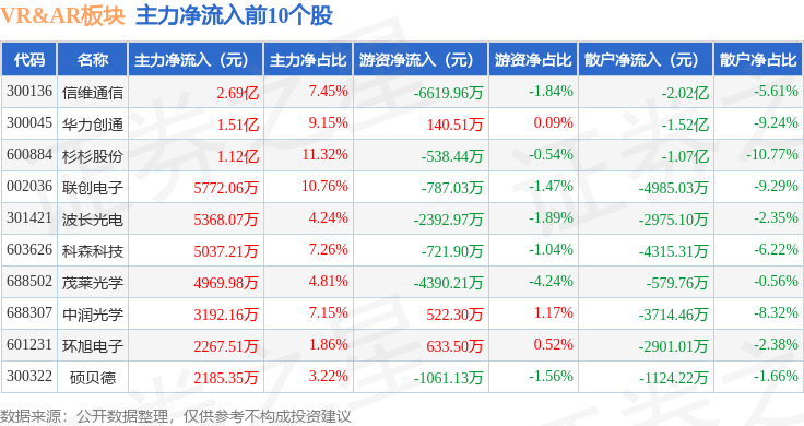 从资金流向上来看,当日VR&AR板块主力资金净流出101.03亿元,游资资金净流入18.82亿元,散户资金净流入82.21亿元。VR&AR板块个股资金流向见下表: