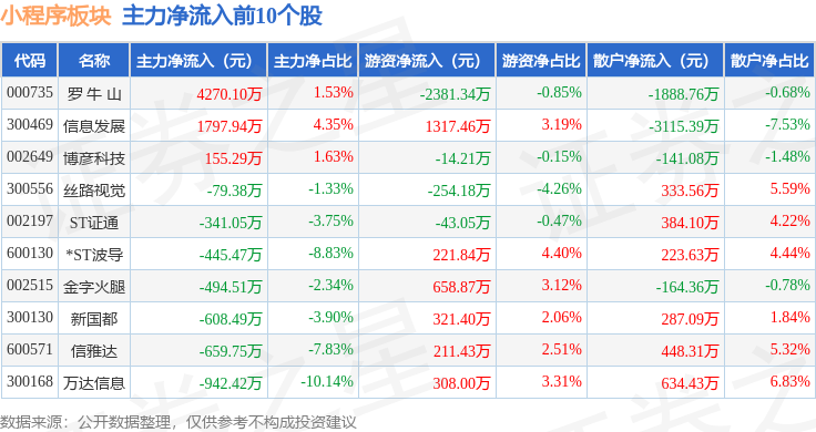 从资金流向上来看,当日小程序板块主力资金净流出5.06亿元,游资资金净流入3358.17万元,散户资金净流入4.73亿元。小程序板块个股资金流向见下表: