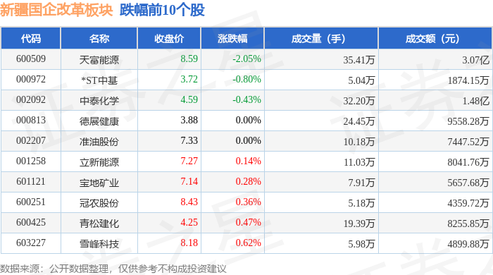 从资金流向上来看,当日新疆国企改革板块主力资金净流入1.28亿元,游资资金净流出6391.39万元,散户资金净流出6386.14万元。新疆国企改革板块个股资金流向见下表: