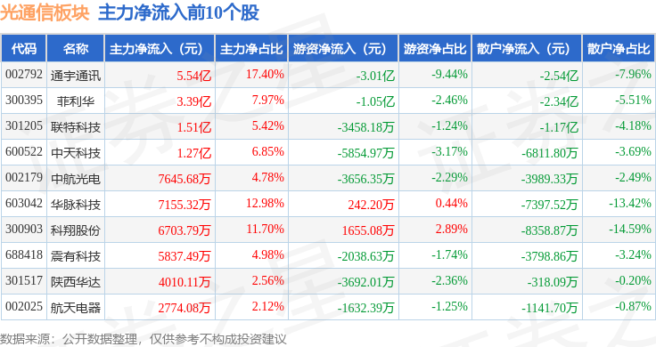 从资金流向上来看,当日光通信板块主力资金净流出98.3亿元,游资资金净流入23.39亿元,散户资金净流入74.91亿元。光通信板块个股资金流向见下表: