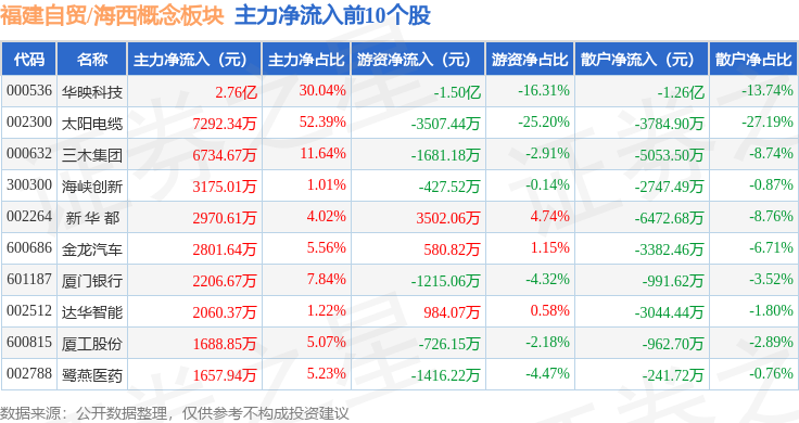 从资金流向上来看,当日福建自贸/海西概念板块主力资金净流出18.4亿元,游资资金净流出1.68亿元,散户资金净流入20.08亿元。福建自贸/海西概念板块个股资金流向见下表: