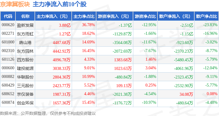 从资金流向上来看,当日京津冀板块主力资金净流出18.42亿元,游资资金净流入4.14亿元,散户资金净流入14.28亿元。京津冀板块个股资金流向见下表: