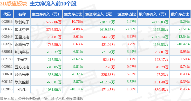 从资金流向上来看,当日3D感应板块主力资金净流出15.83亿元,游资资金净流入1.27亿元,散户资金净流入14.56亿元。3D感应板块个股资金流向见下表: