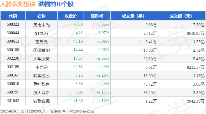 从资金流向上来看,当日人脸识别板块主力资金净流出3.64亿元,游资资金净流出1540.23万元,散户资金净流入3.8亿元。人脸识别板块个股资金流向见下表: