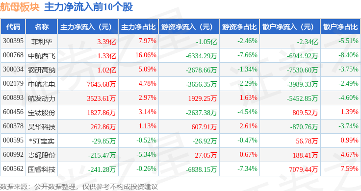 从资金流向上来看,当日航母板块主力资金净流出1.92亿元,游资资金净流出3.88亿元,散户资金净流入5.8亿元。航母板块个股资金流向见下表: