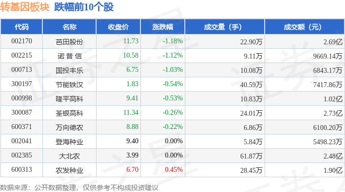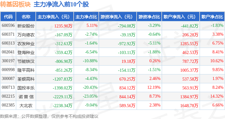从资金流向上来看,当日转基因板块主力资金净流出1.06亿元,游资资金净流入1554.11万元,散户资金净流入9082.36万元。转基因板块个股资金流向见下表:
