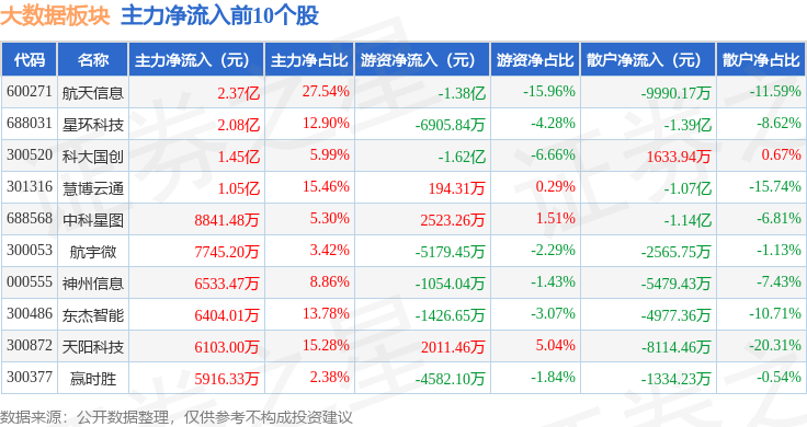 从资金流向上来看,当日大数据板块主力资金净流出78.14亿元,游资资金净流入12.07亿元,散户资金净流入66.07亿元。大数据板块个股资金流向见下表: