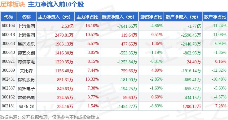 从资金流向上来看,当日足球板块主力资金净流入7022.92万元,游资资金净流出5174.19万元,散户资金净流出1848.73万元。足球板块个股资金流向见下表: