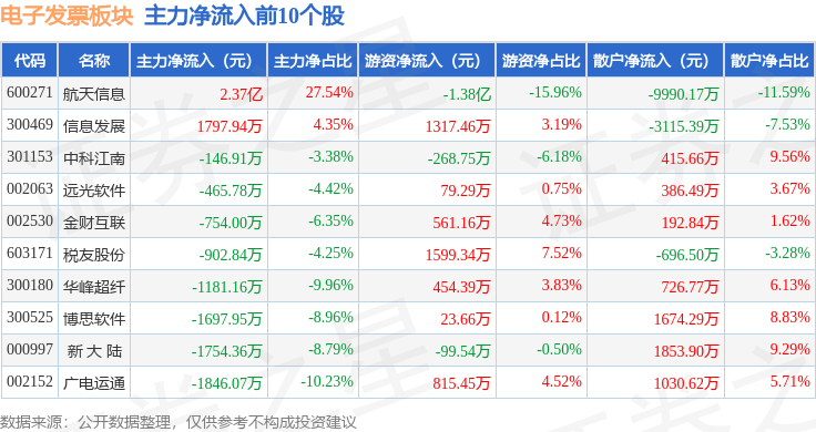 从资金流向上来看,当日电子发票板块主力资金净流出3.22亿元,游资资金净流出1.1亿元,散户资金净流入4.32亿元。电子发票板块个股资金流向见下表: