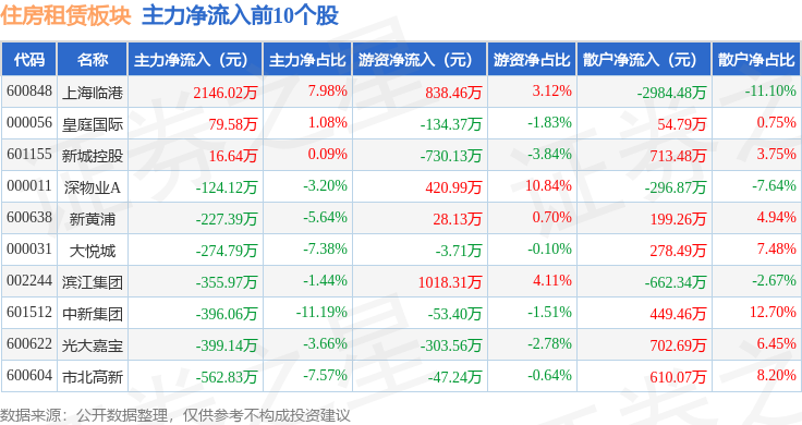 从资金流向上来看,当日住房租赁板块主力资金净流出7.24亿元,游资资金净流入2890.56万元,散户资金净流入6.95亿元。住房租赁板块个股资金流向见下表: