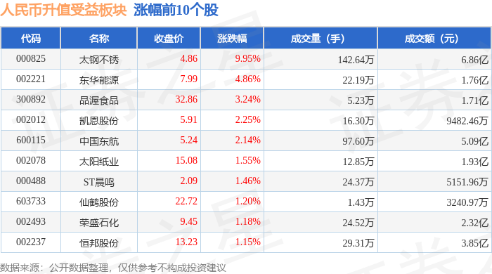 证券之星消息,12月15日人民币升值受益板块较上一交易日上涨0.5%,太钢不锈领涨。当日上证指数报收于3867.92,下跌0.55%。深证成指报收于13112.09,下跌1.1%。人民币升值受益板块个股涨跌见下表: