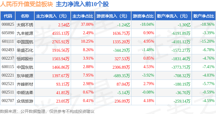 从资金流向上来看,当日人民币升值受益板块主力资金净流入6180.11万元,游资资金净流入5012.48万元,散户资金净流出1.12亿元。人民币升值受益板块个股资金流向见下表: