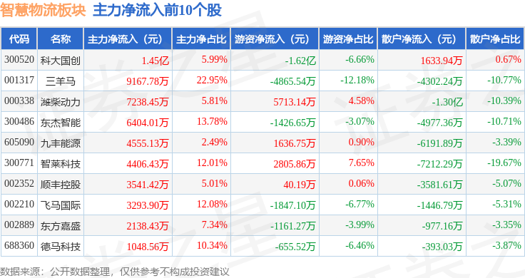 从资金流向上来看,当日智慧物流板块主力资金净流出5.31亿元,游资资金净流入7621.67万元,散户资金净流入4.55亿元。智慧物流板块个股资金流向见下表: