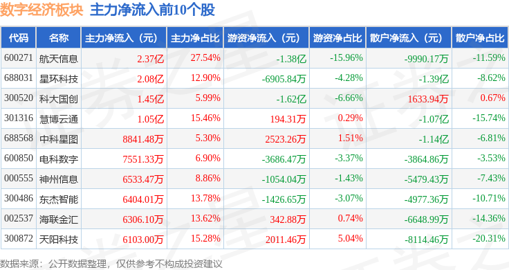 从资金流向上来看,当日数字经济板块主力资金净流出59.45亿元,游资资金净流入6.2亿元,散户资金净流入53.25亿元。数字经济板块个股资金流向见下表: