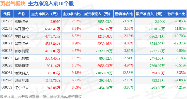 从资金流向上来看,当日页岩气板块主力资金净流入4.01亿元,游资资金净流入379.01万元,散户资金净流出4.04亿元。页岩气板块个股资金流向见下表: