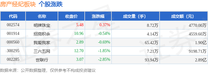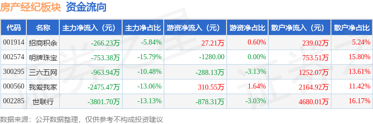 从资金流向上来看,当日房产经纪板块主力资金净流出8260.71万元,游资资金净流出828.81万元,散户资金净流入9089.53万元。房产经纪板块个股资金流向见下表: