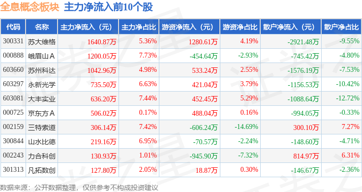 从资金流向上来看,当日全息概念板块主力资金净流出12.88亿元,游资资金净流入3.87亿元,散户资金净流入9.01亿元。全息概念板块个股资金流向见下表: