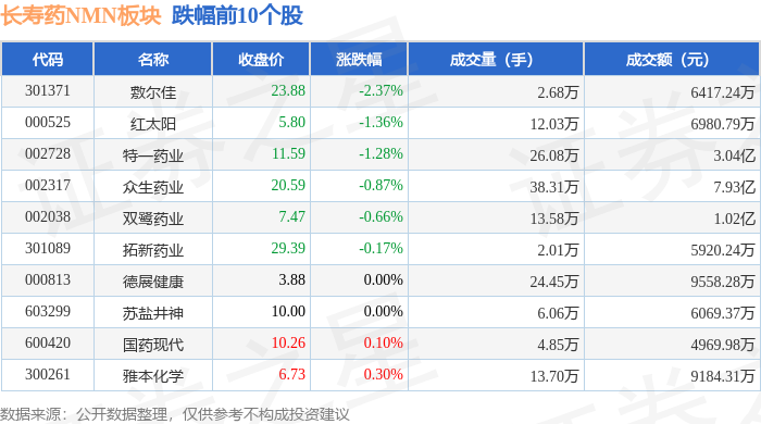 从资金流向上来看,当日长寿药NMN板块主力资金净流出3287.62万元,游资资金净流入2478.9万元,散户资金净流入808.72万元。长寿药NMN板块个股资金流向见下表: