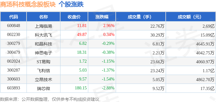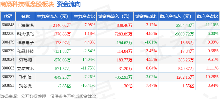 从资金流向上来看,当日商汤科技概念股板块主力资金净流出2.65亿元,游资资金净流入2.09亿元,散户资金净流入5638.24万元。商汤科技概念股板块个股资金流向见下表: