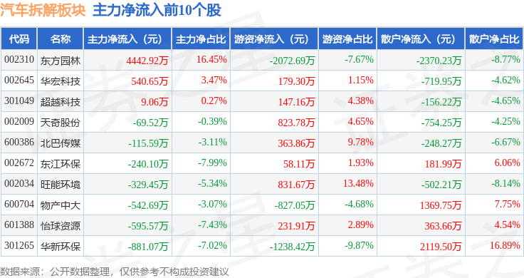 从资金流向上来看,当日汽车拆解板块主力资金净流出1.06亿元,游资资金净流入880.8万元,散户资金净流入9761.59万元。汽车拆解板块个股资金流向见下表: