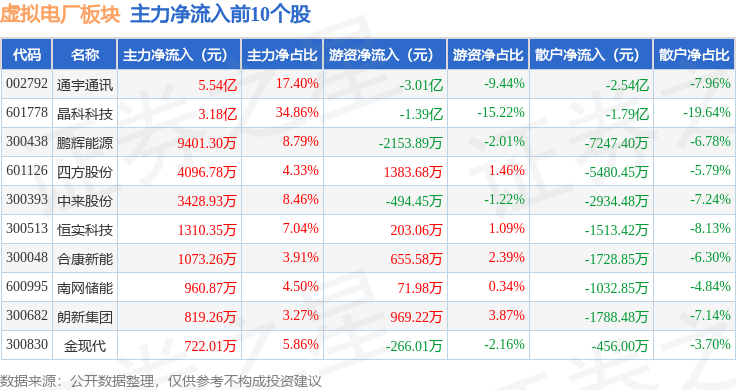 从资金流向上来看,当日虚拟电厂板块主力资金净流出9.19亿元,游资资金净流出1.44亿元,散户资金净流入10.63亿元。虚拟电厂板块个股资金流向见下表: