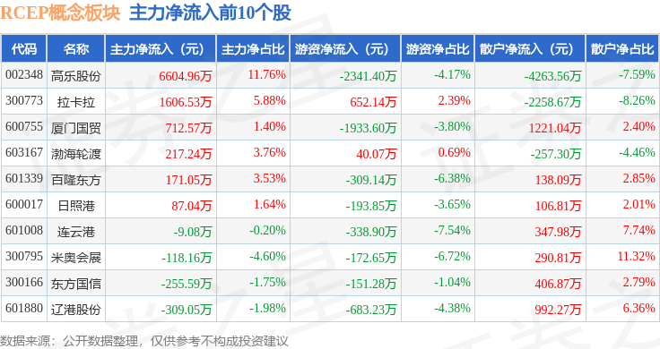 从资金流向上来看,当日RCEP概念板块主力资金净流出5620.05万元,游资资金净流出5448.58万元,散户资金净流入1.11亿元。RCEP概念板块个股资金流向见下表: