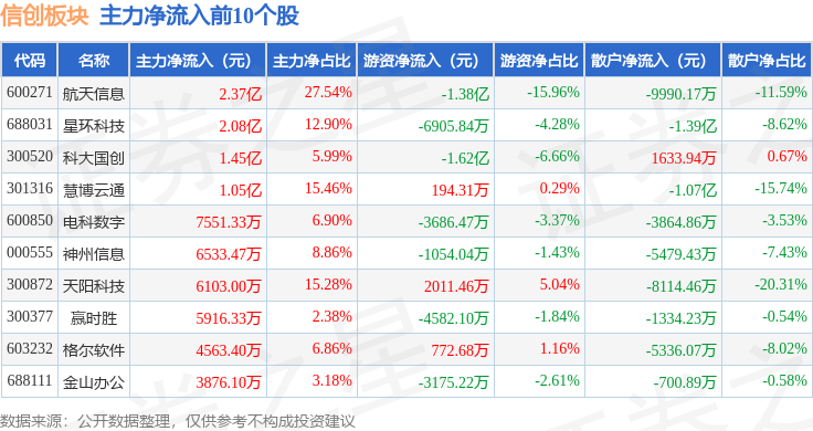 从资金流向上来看,当日信创板块主力资金净流出53.81亿元,游资资金净流入17.56亿元,散户资金净流入36.24亿元。信创板块个股资金流向见下表: