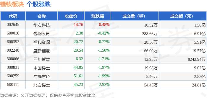 证券之星消息,12月15日镨钕板块较上一交易日下跌1.53%,北方稀土领跌。当日上证指数报收于3867.92,下跌0.55%。深证成指报收于13112.09,下跌1.1%。镨钕板块个股涨跌见下表: