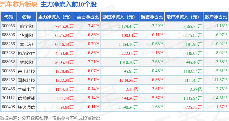 从资金流向上来看,当日汽车芯片板块主力资金净流出40.5亿元,游资资金净流入12.57亿元,散户资金净流入27.93亿元。汽车芯片板块个股资金流向见下表: