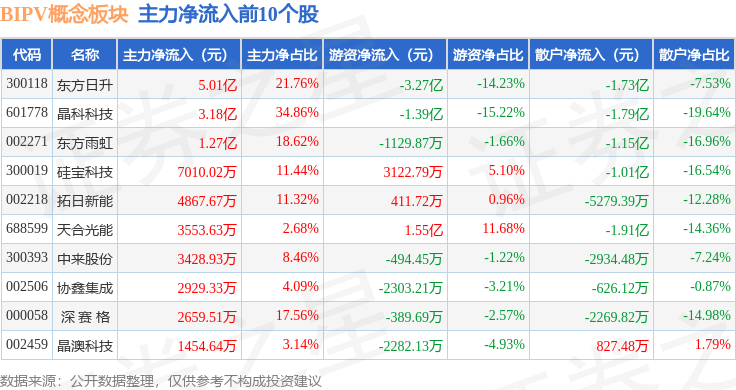 从资金流向上来看,当日BIPV概念板块主力资金净流入2.9亿元,游资资金净流出1.04亿元,散户资金净流出1.86亿元。BIPV概念板块个股资金流向见下表: