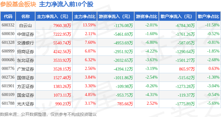 从资金流向上来看,当日参股基金板块主力资金净流出4.78亿元,游资资金净流入2.05亿元,散户资金净流入2.73亿元。参股基金板块个股资金流向见下表: