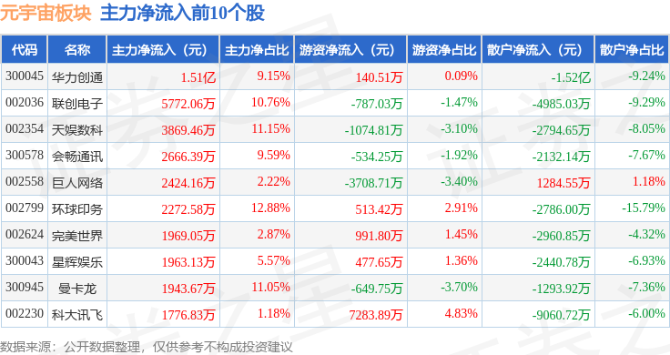 从资金流向上来看,当日元宇宙板块主力资金净流出30.89亿元,游资资金净流入4.84亿元,散户资金净流入26.05亿元。元宇宙板块个股资金流向见下表: