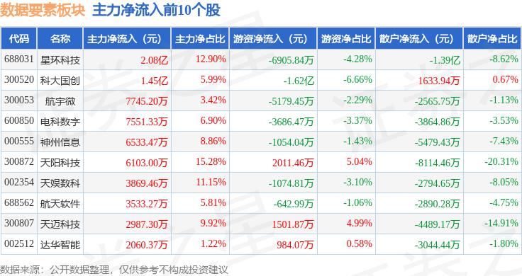 从资金流向上来看,当日数据要素板块主力资金净流出9.84亿元,游资资金净流出2.41亿元,散户资金净流入12.25亿元。数据要素板块个股资金流向见下表: