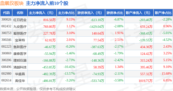 从资金流向上来看,当日血氧仪板块主力资金净流出8805.98万元,游资资金净流入270.9万元,散户资金净流入8535.08万元。血氧仪板块个股资金流向见下表: