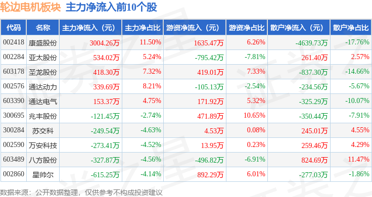从资金流向上来看,当日轮边电机板块主力资金净流出6.58亿元,游资资金净流入1.39亿元,散户资金净流入5.19亿元。轮边电机板块个股资金流向见下表: