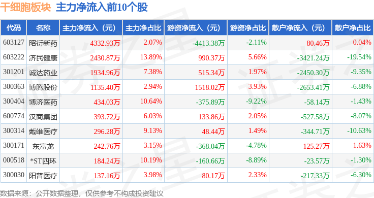 从资金流向上来看,当日干细胞板块主力资金净流出1.13亿元,游资资金净流入4119.54万元,散户资金净流入7176.73万元。干细胞板块个股资金流向见下表: