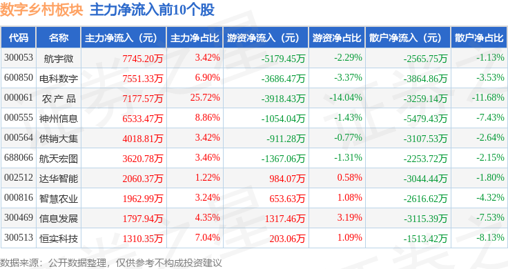 从资金流向上来看,当日数字乡村板块主力资金净流出10.1亿元,游资资金净流入9376.6万元,散户资金净流入9.16亿元。数字乡村板块个股资金流向见下表: