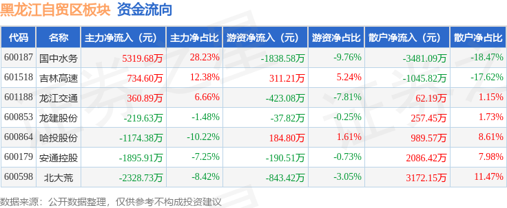从资金流向上来看,当日黑龙江自贸区板块主力资金净流入796.52万元,游资资金净流出2837.4万元,散户资金净流入2040.88万元。黑龙江自贸区板块个股资金流向见下表: