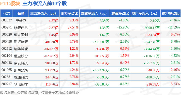 从资金流向上来看,当日ETC板块主力资金净流入1.2亿元,游资资金净流出4.06亿元,散户资金净流入2.86亿元。ETC板块个股资金流向见下表: