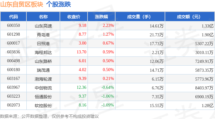 证券之星消息,12月15日山东自贸区板块较上一交易日上涨1.1%,山东高速领涨。当日上证指数报收于3867.92,下跌0.55%。深证成指报收于13112.09,下跌1.1%。山东自贸区板块个股涨跌见下表: