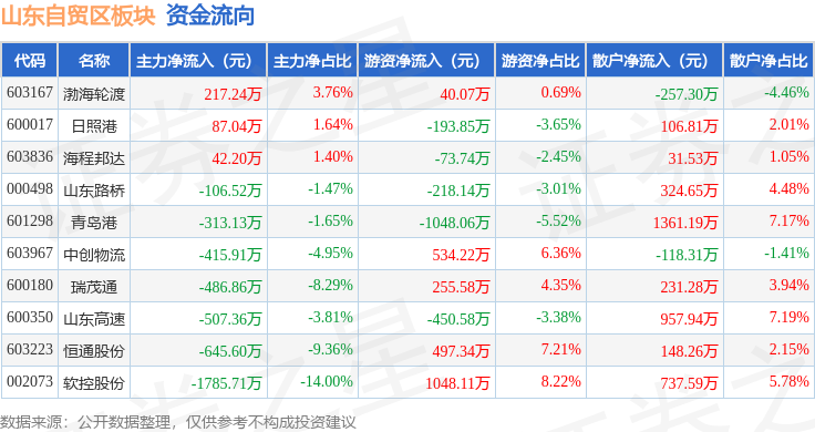 从资金流向上来看,当日山东自贸区板块主力资金净流出3914.6万元,游资资金净流入390.95万元,散户资金净流入3523.65万元。山东自贸区板块个股资金流向见下表:
