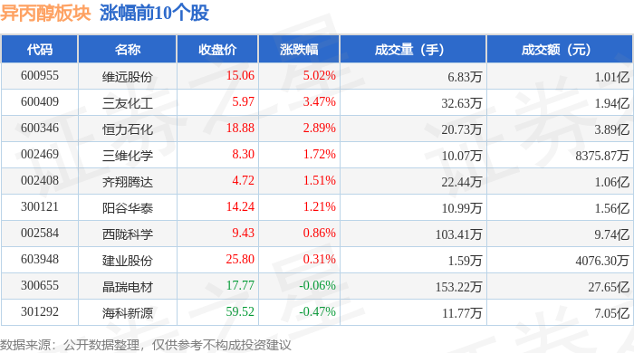 证券之星消息,12月15日异丙醇板块较上一交易日上涨2.21%,维远股份领涨。当日上证指数报收于3867.92,下跌0.55%。深证成指报收于13112.09,下跌1.1%。异丙醇板块个股涨跌见下表: