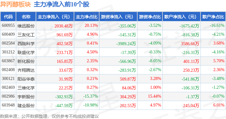 从资金流向上来看,当日异丙醇板块主力资金净流出1.86亿元,游资资金净流入3427.54万元,散户资金净流入1.52亿元。异丙醇板块个股资金流向见下表: