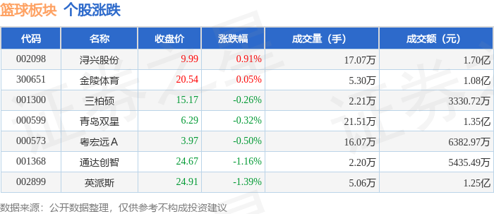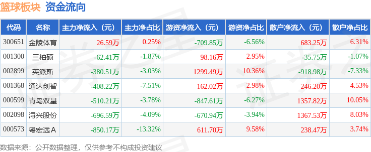 从资金流向上来看,当日篮球板块主力资金净流出2881.51万元,游资资金净流出57.02万元,散户资金净流入2938.53万元。篮球板块个股资金流向见下表: